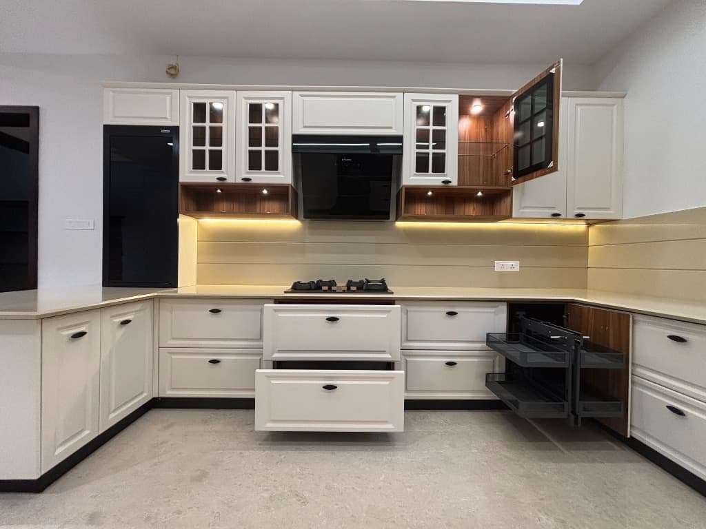 At Asure Kitchen -N- Interiors, we specialize in creating customized kitchen designs that reflect your personal style while maximizing functionality. Whether you prefer a modern sleek look or a timeless classic aesthetic, our expert team will work closely with you to understand your vision and requirements. We incorporate smart storage solutions and high-quality materials ensuring durability and ease of use. From layout planning to selecting finishes, every detail is carefully considered so that your kitchen not only meets but exceeds expectations.