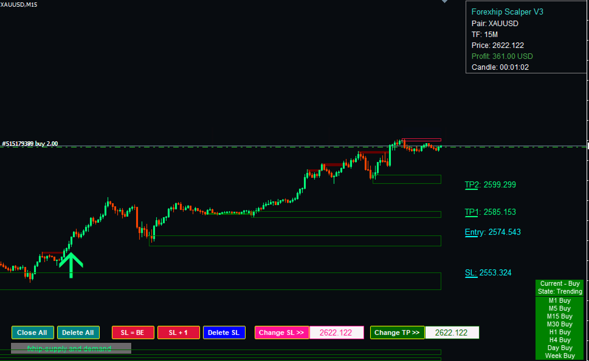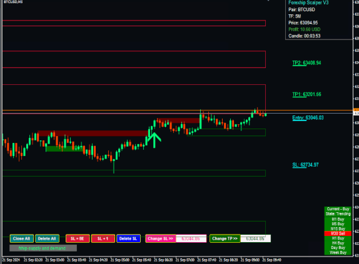 Adjustable Support and Resistance with three different sensitivity settings. Adjustable TP & SL based on volatility Ichimoku Cloud Filter. Forexhip Scalper V3 Smart dashboard to see all signals on multiple timeframes Market state indicator on the dashboard (Trending and Ranging)