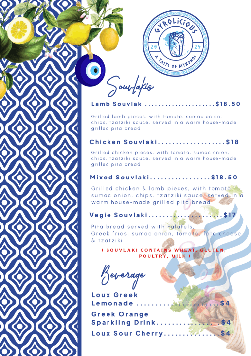 Gyrolicious proudly serves authentic Greek street food, drawing inspiration from Greece's heart. Our menu showcases souvlaki, expertly prepared with marinated meats, fresh vegetables, and homemade tzatziki sauce, served in warm pita bread. High-quality ingredients are carefully selected to craft each dish, ensuring authentic Mediterranean flavours that transport your taste buds to Greece's stunning shores.