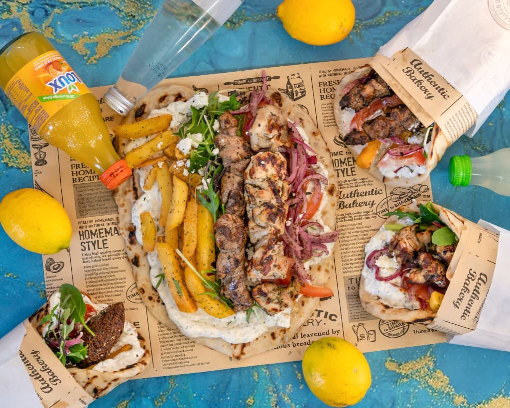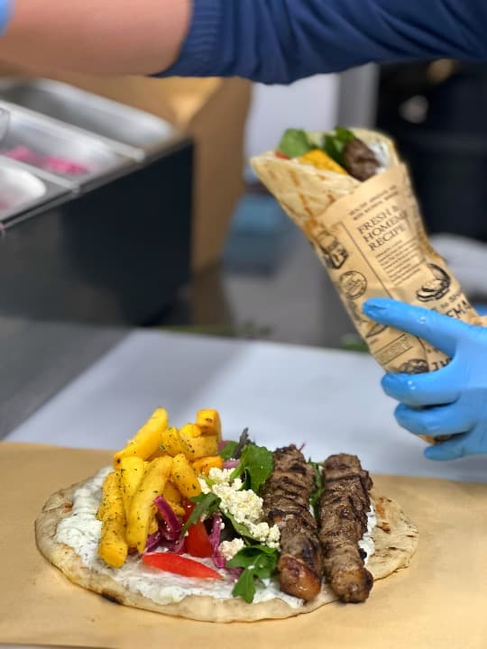 Experience authentic Greek street food from our food trailer. Dive into delicious and mouthwatering souvlakis today!