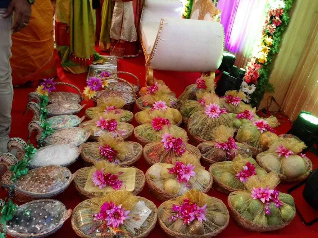 We specialize in Seer Varisai Plate Decoration for all traditional South Indian functions such as: Engagements, Weddings, Baby Showers, Nichayathartham, Birthdays, Ear Piercing, and Naming Ceremonies. Our plates are decorated with unique color themes, premium materials, and elegant props, ensuring every display looks royal and personalized.