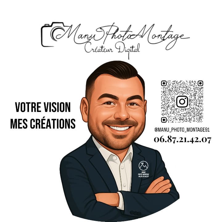 Manu Photo Montage est une entreprise spécialisée dans la création de montages photo personnalisés, la retouche professionnelle et la conception visuelle sur mesure. Basée sur la passion de l’image et le sens du détail, notre mission est de transformer vos idées, souvenirs ou projets visuels en réalisations uniques et percutantes. Notre savoir-faire Avec une solide expérience dans le montage photo et le graphisme, nous mettons notre expertise au service de particuliers, créateurs de contenu, artistes et entreprises. Chaque projet est traité avec rigueur, créativité et sens artistique pour garantir un rendu professionnel et original. Nous proposons notamment : 📸 Montages photo créatifs et sur-mesure 🎨 Retouches d’images professionnelles (portraits, objets, paysages…) 🖼️ Création de visuels pour les réseaux sociaux, flyers, affiches, couvertures, etc. 💡 Projets personnalisés selon vos besoins (événements, communication, marketing, etc.) Pourquoi choisir Manu Photo Montage ? ✅ Un travail soigné et rapide ✅ Une approche humaine et à l’écoute ✅ Des créations 100 % personnalisées ✅ Des tarifs clairs et accessibles Prêt à donner vie à vos idées ? Contactez-nous dès aujourd’hui pour discuter de votre projet. Nous vous accompagnons de la conception à la livraison finale, avec professionnalisme et créativité.
